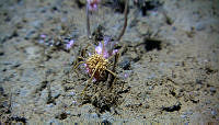 Tangloppen Neohela stikker hodet frem inne i sin utgravde "leilighet" på 850 meters dyp på eggakanten utenfor Mørebankene. R1270VL1309 still e-00-14-36