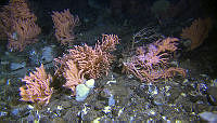Hardbunns korallskog med risengrynkorall (Primnoa resedaeformis) på ujevn steinbunn med grus og sand på ca. 460 meters dyp (Storegga). R1258VL1297 still e-00-02-38